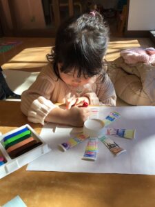 「どんな色にしようかな」と考えながら、クレヨンでぬりぬり…。