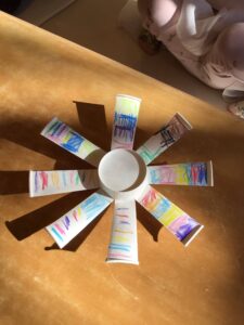 切った紙コップをひとつずつ開いていくと、まるで花びらのよう🌼